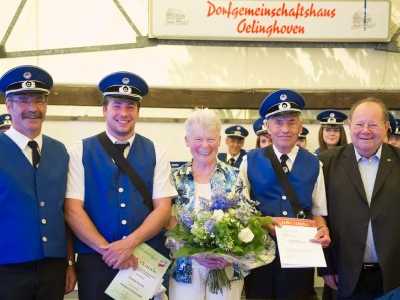 Während der Bürgerverein Stieldorferhohn am Samstag und Sonntag auf der "Siloplatte der Familie Nietzer" feierte, hatte das Tambourcorps Oelinghoven wieder in das Dorfgemeinschaftshaus eingeladen. Dort sorgte der MGV "Frohsinn" für die musikalische Unterhaltung und die Köchinnen konnten 756 Eier, die an den Vortagen im Ort gesammelt worden waren, zu Eierkuchen verarbeiten. "Bis zum Abend haben wir die aber locker geschafft", war sich der Vorsitzende des Gastgebers, Paul Severin, sicher, der mit seiner Truppe die Besucher, darunter Urgestein Hans Remig, vor den Ehrungen durch Robert Moers vom Kreismusikerbund unterhielt. Mit der altsilbernen Ehrennadel zeichnet dieser zunächst Sascha Severin aus, um sich dann dem Nestor des Vereins zu widmen. "Dass Heinrich Hüls schon seit 60 Jahren im TC mitspielt, ist eine wahrlich gigantische Leistung", so Moers. Dafür darf der Musiker, der nach den Worten seines Nachfolgers den Verein 30 Jahre lang als Erster Vorsitzender zusammengehalten hatte, mit Ehefrau Marlene demnächst vornehm dinieren. Außerdem gab's einen Frühstückskorb, den ihnen die Mitglieder als weiteres Dankeschön schenkten.